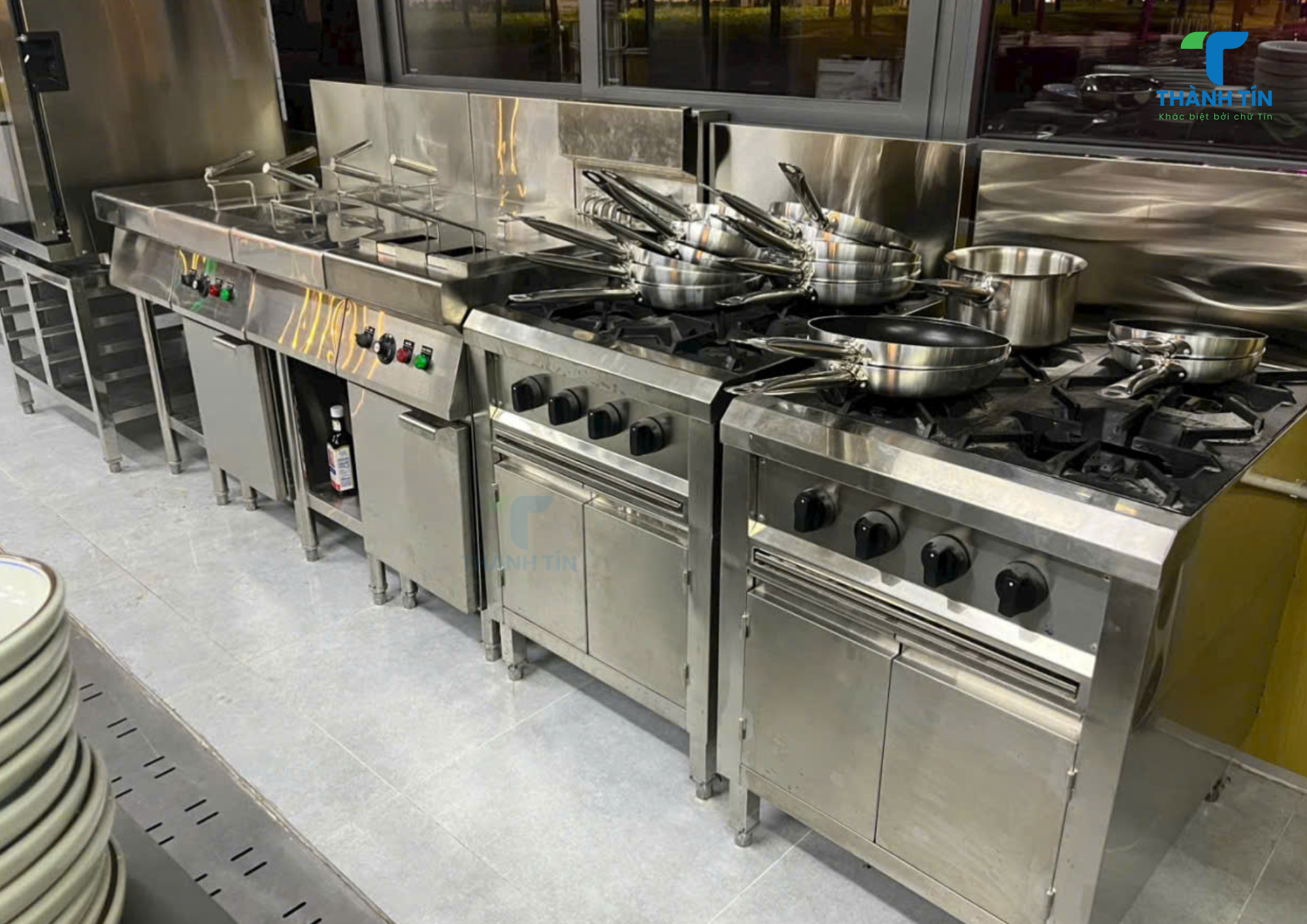 Thiết bị đồng bộ – hiện đại: Bao gồm bếp Á, bếp Âu, lò nướng, tủ hấp, tủ lạnh công nghiệp, chụp hút mùi, bàn sơ chế, hệ thống gas an toàn…