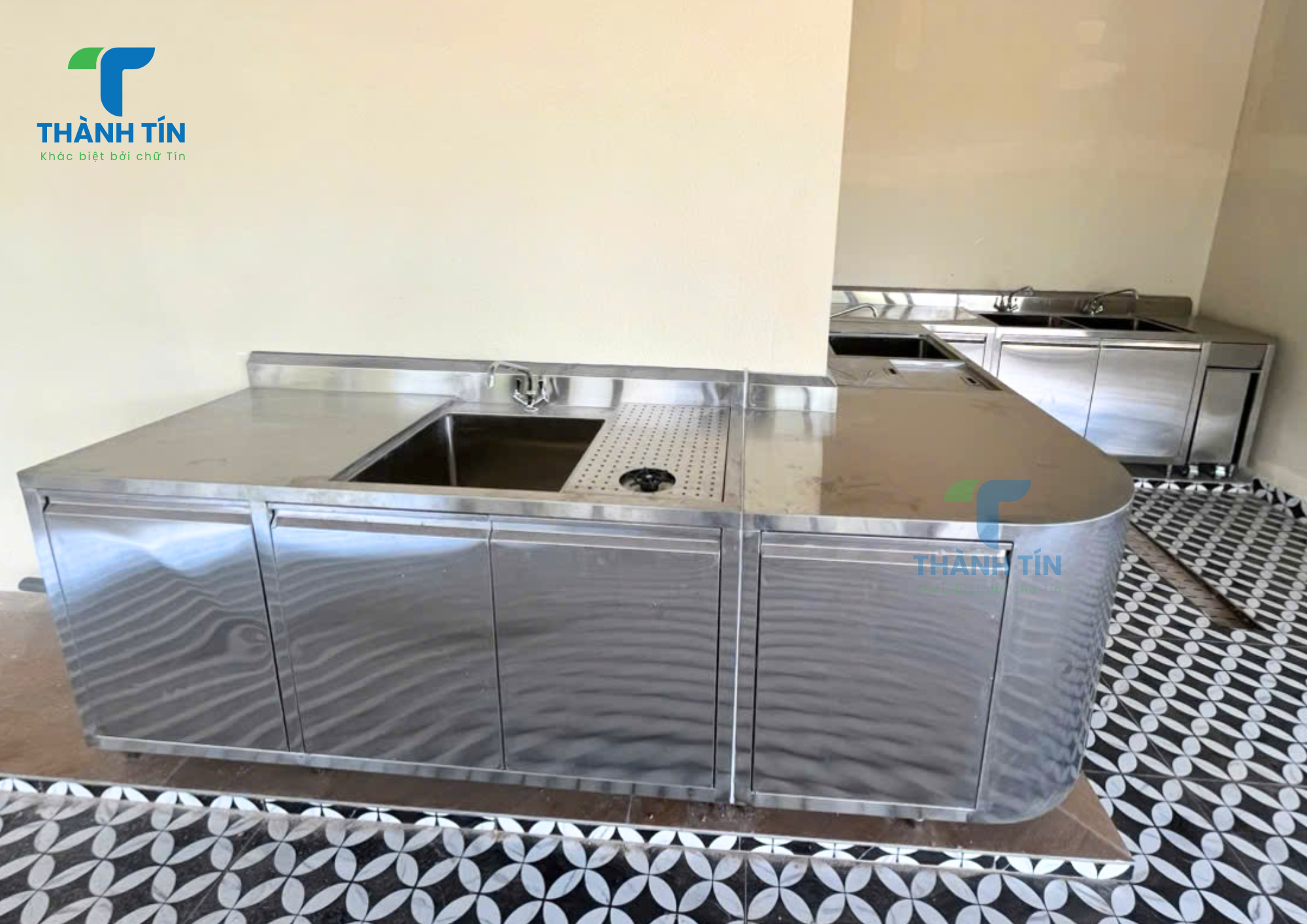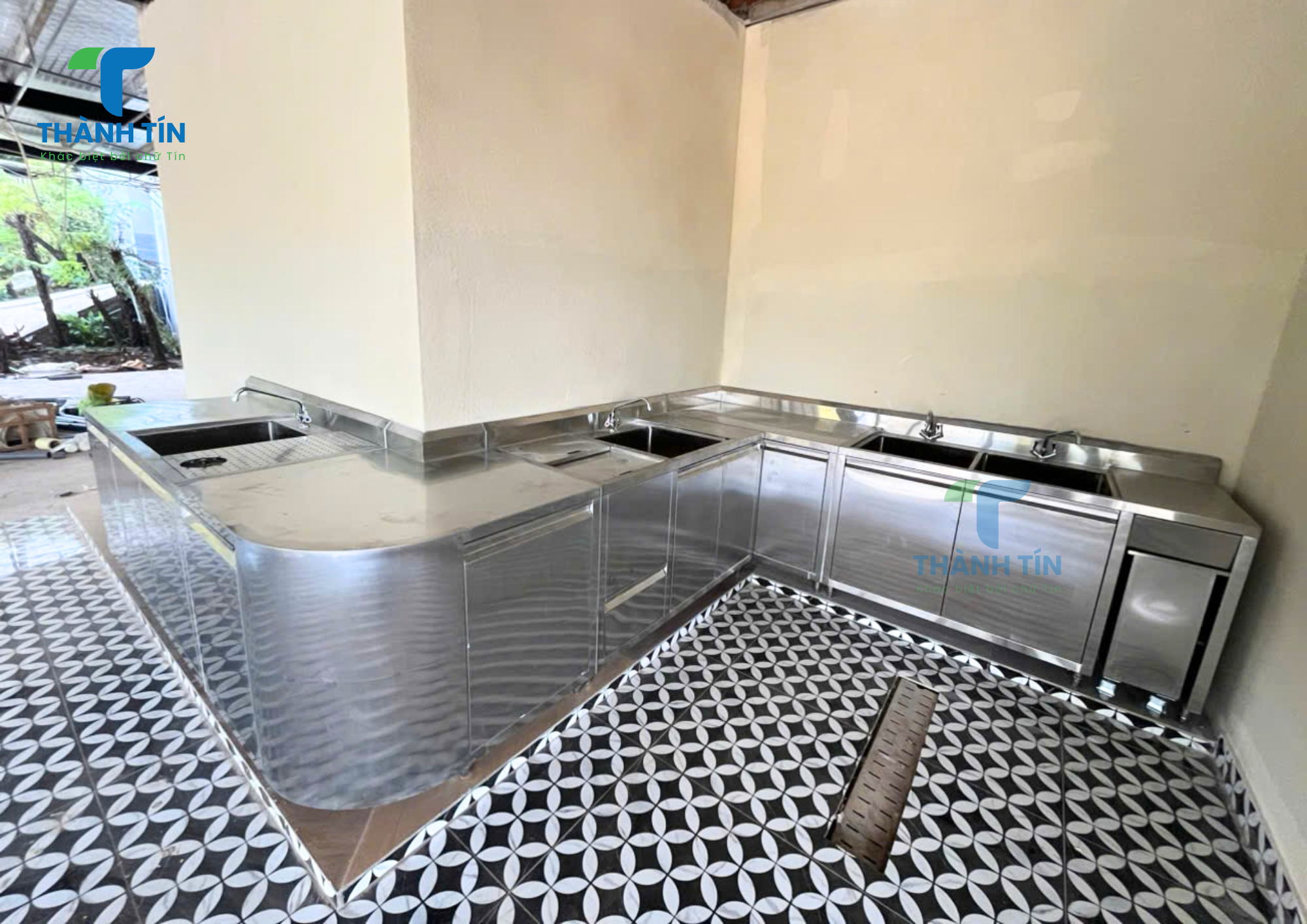 Toàn bộ hệ quầy được gia công từ vật liệu inox chất lượng cao, đảm bảo độ bền, dễ vệ sinh và thích ứng tốt với điều kiện vận hành tại khu du lịch.