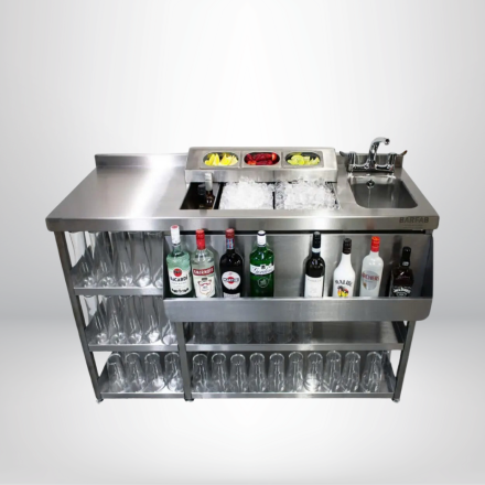 QUẦY PHA CHẾ INOX CÓ RAIL ĐỰNG SIRUP VÀ LY